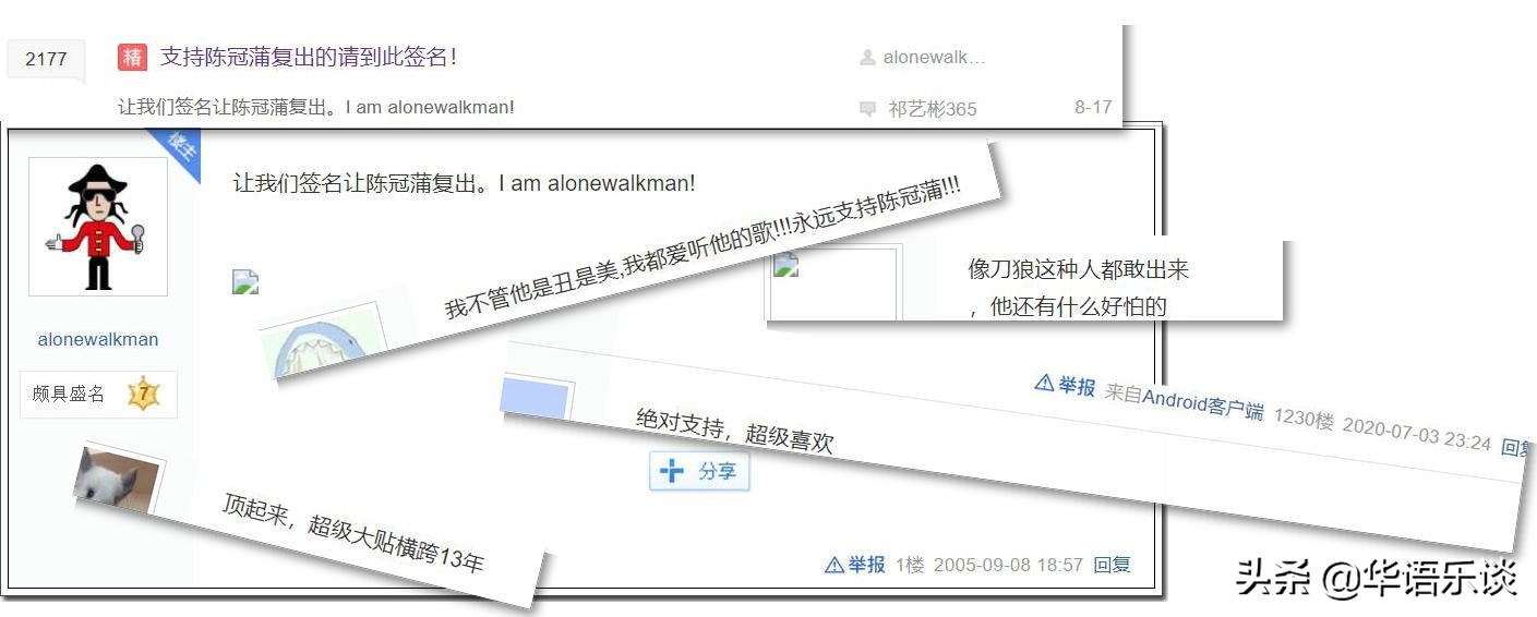 在贴吧“陈冠蒲吧”,有一个帖子,标题叫“支持陈冠蒲复出的请到此签名”,该帖子发布于2005年9月8日,至此已经延续了15年,已经有2177个回复,每年每月每周都不停地有歌迷前往签名表达意愿,最后一个回复是在本周内……