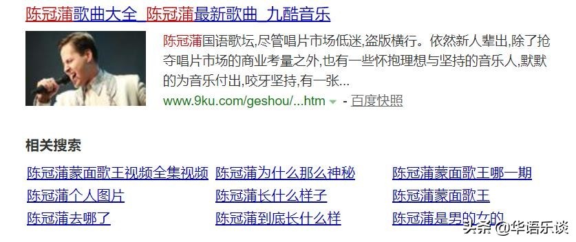 如今在网上搜索“陈冠蒲”这个关键词,相关搜索都是“陈冠蒲个人图片”“陈冠蒲到底长什么样”“陈冠蒲是男是女”“陈冠蒲去哪了”,还有“陈冠蒲蒙面歌王”。