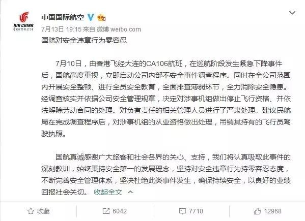 民航局表示,此次事件的详细原因正在调查核实,如属实会依法依规,严厉查处。当晚国航发布消息,决定对涉事机组做出停止飞行资格、并依法解除劳动合同。