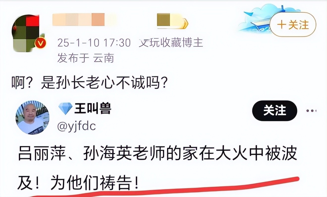 而当洛杉矶山火爆发后,有位名叫“王叫兽”的网友透露:吕丽萍、孙海英老师的家在大火中被波及,言外之意是说可能被烧毁了。