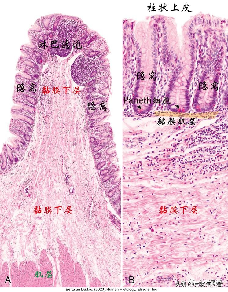 盲肠黏膜被覆上皮由柱状吸收细胞及杯状细胞构成。盲肠黏膜与黏膜下层常含有淋巴滤泡,黏膜延伸入固有层形成Lieberkühn隐窝,位于黏膜肌层下方的隐窝底部具有嗜酸性颗粒的潘氏细胞。