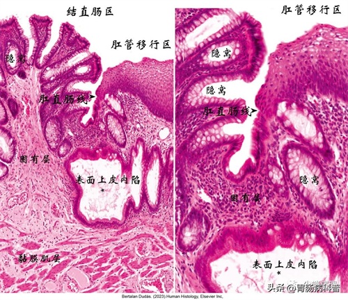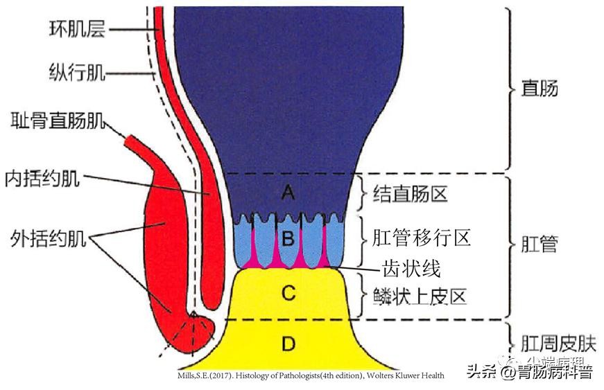 肛管分为近端的结直肠区,肛管移行区,皮肤(鳞状上皮)区。结直肠区被覆柱状上皮。肛门直肠线是结直肠区和肛管移行区交界,从柱状上皮突变为复层立方上皮,然后转变为复层非角化或角化不全鳞状上皮,排列于肛门移行区。