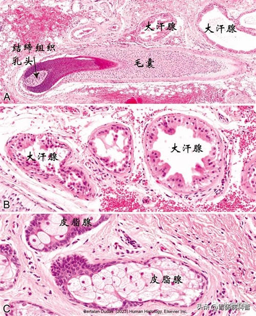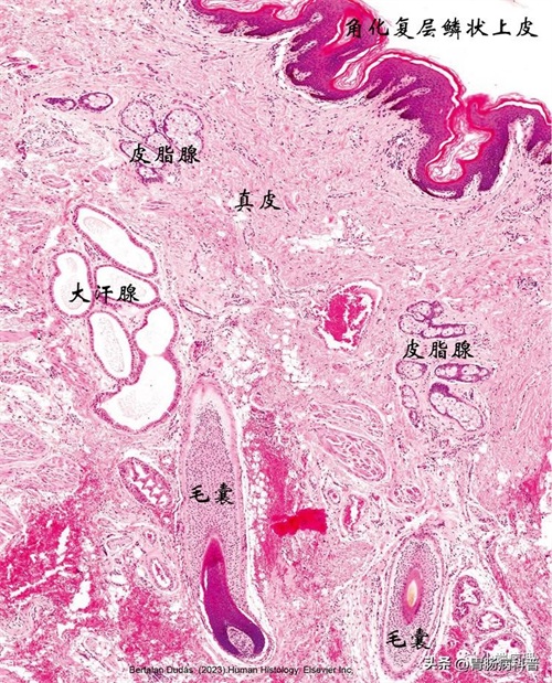 肛管的皮肤区被覆角化复层鳞状上皮,其下为不规则致密结缔组织真皮,并含有与毛囊、皮脂腺,还有大量的管腔扩张的大汗腺(肛周腺)。