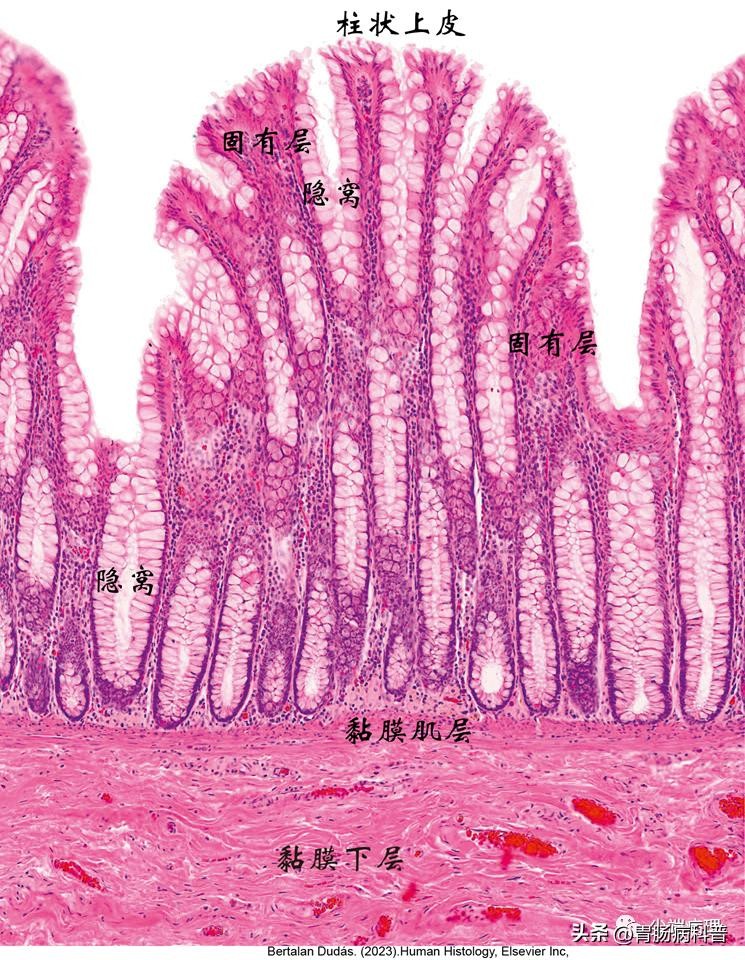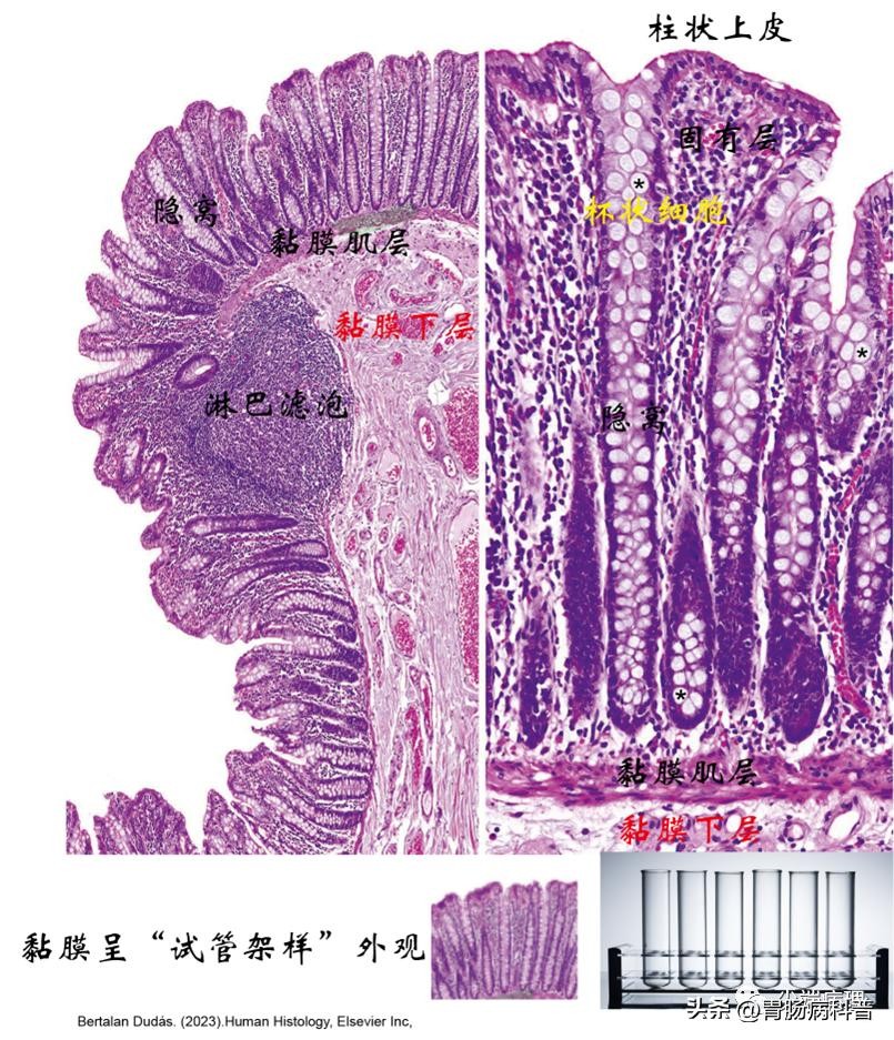 结肠分为:黏膜层、黏膜下层、肌层和浆膜。其中黏膜上皮由柱状上皮被覆,柱状上皮内衬于隐窝内,这些隐窝深达黏膜固有层垂直于黏膜肌层,呈“试管架样”外观。表面上皮由结肠细胞(吸收细胞、M细胞)和杯状细胞等组成。