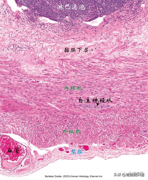 阑尾黏膜上皮由柱状细胞以及杯状细胞组成,它们延伸入Lieberkühn隐窝,此处杯状细胞数量较多。黏膜固有层含有大量Lieberkühn 隐窝大量的嗜酸性粒细胞。黏膜肌层下方为黏膜下层。内环肌和外纵肌之间有肌间自主神经丛,浆膜有血管、神经及间皮覆盖。