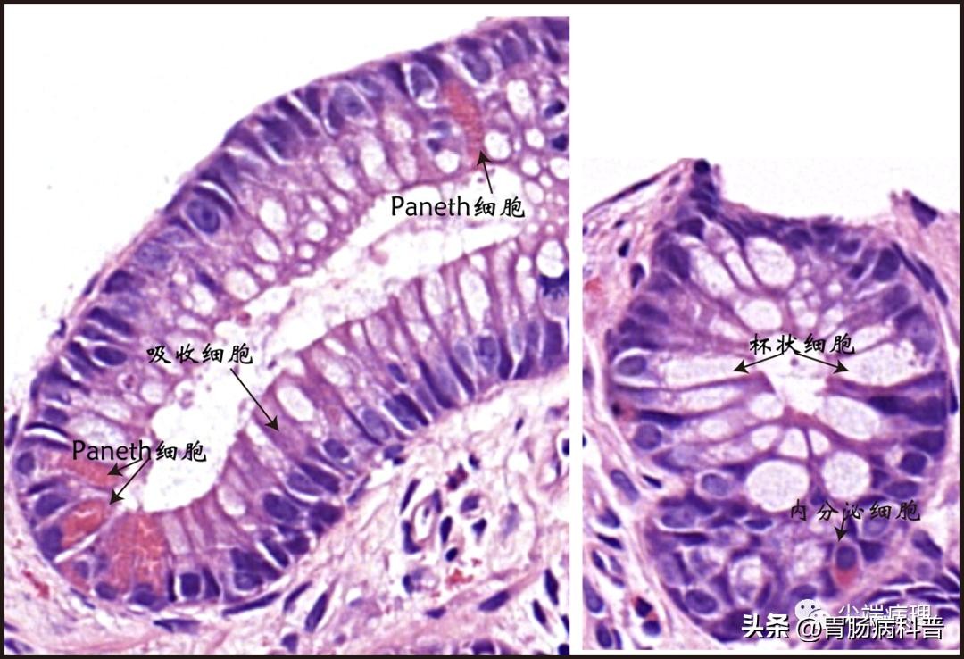 右半结肠的结肠细胞/杯状细胞数约为5:1,该比值在左半结肠为3-4:1。Paneth细胞在右半结肠隐窝底部可见,远端1/3横结肠后出现,则提示出现慢性黏膜损伤的化生。而且右半结肠的上皮内淋巴细胞密度高于左半结肠。