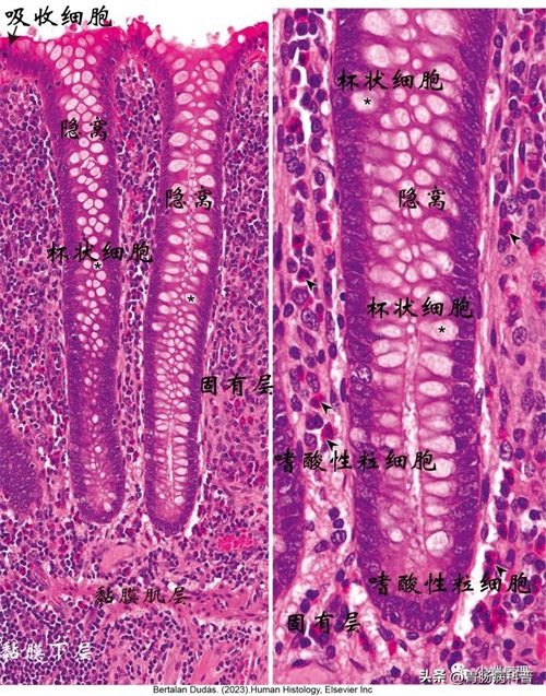 上皮延伸入Lieberkühn 隐窝,这些隐窝深达黏膜固有层垂直于黏膜肌层,呈“试管架样”外观。隐窝内含有大量杯状细胞,黏膜固有层含有淋巴滤泡。