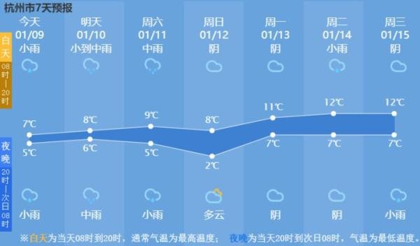 据杭州市气象台消息,随着雨带东移,1月9日中午前后雨水到场,这一次逗留时间不短。1月9日下午到1月10日上午以小雨为主,10日下午到11日白天雨水增强为中雨,局部还会有大雨出现。