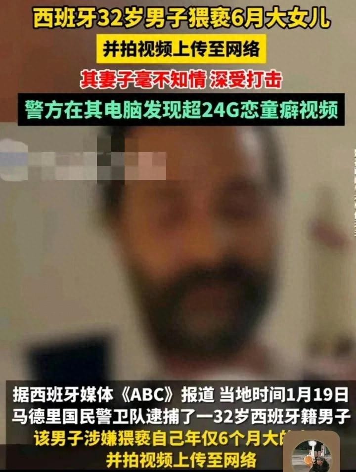 西班牙,当地时间19日,马德里国民警卫队逮捕了一名32岁的西班牙籍男子。这名男子犯的罪让所有人都感到震惊,不敢相信,太丧心病狂了!