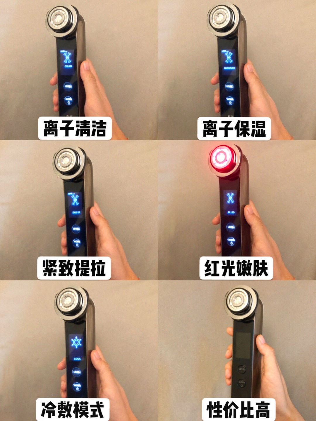 这个是我的最爱!射频红光,促进胶原蛋白新生,面霜或者乳液涂抹均匀后,在脸部轻压照射,每次用完都感觉脸蛋软软的,自己都忍不住去捏啊哈哈哈~超爱这个功能