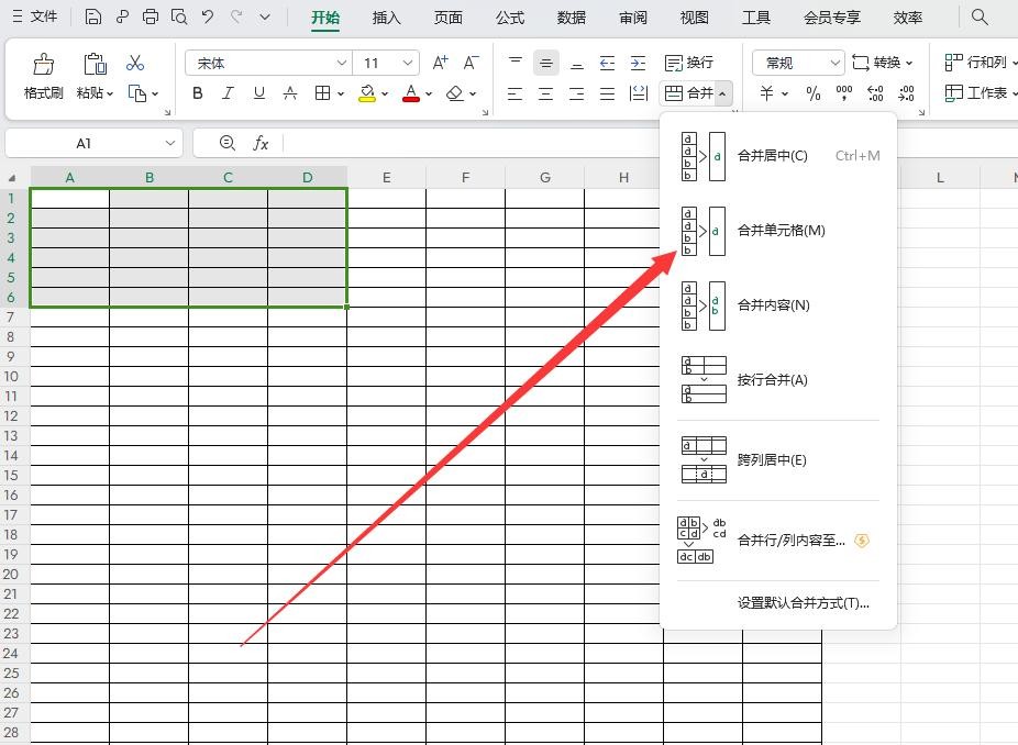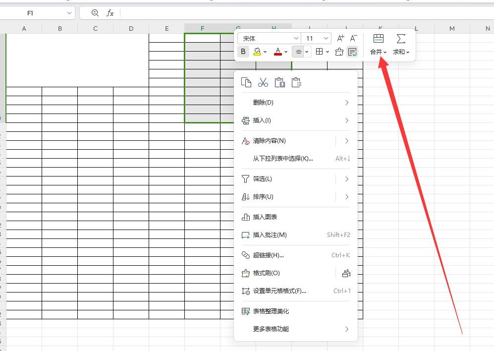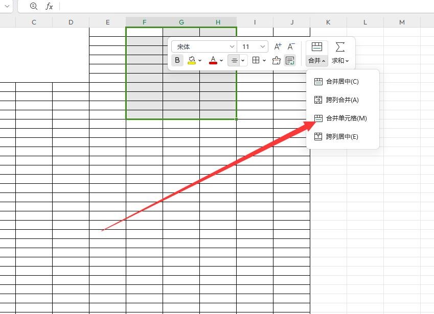 3.在下拉页面点击“合并单元格”,即可完成合并。