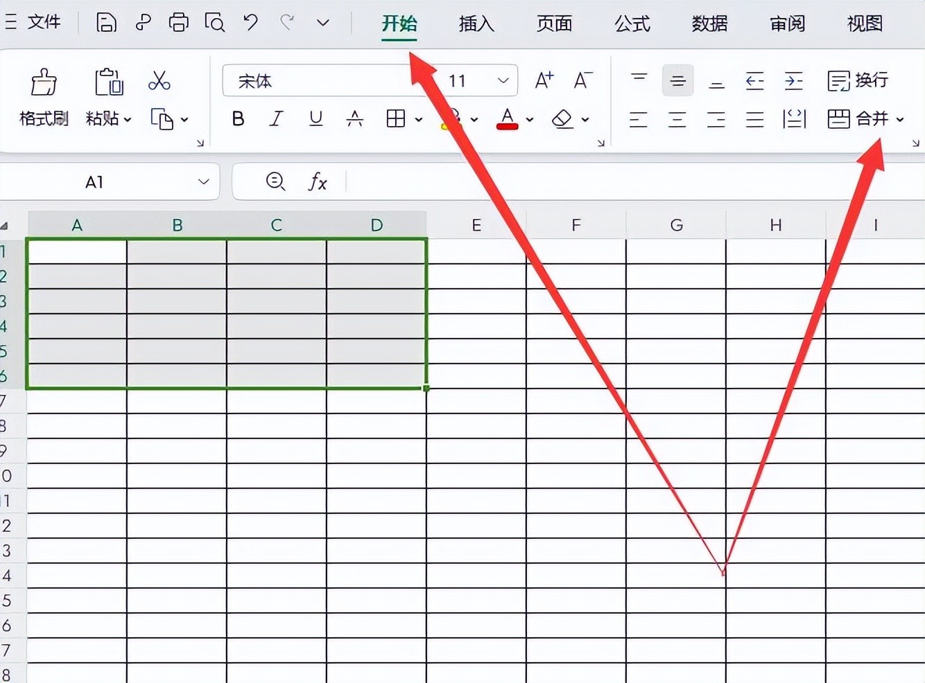 2.点击开始菜单栏,然后点击工具栏“合并”,完成合并单元格(或点击合并旁边的箭头);