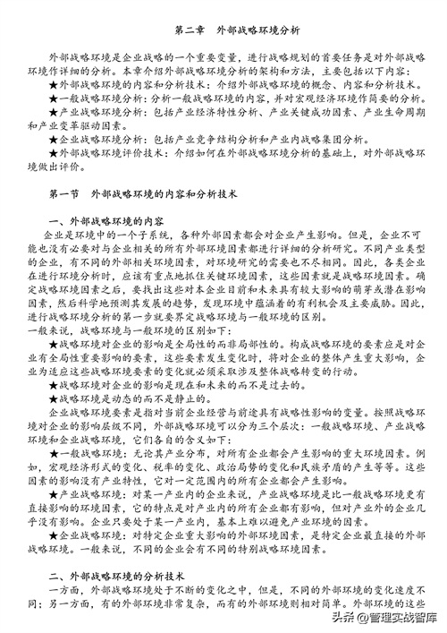 战略管理概述:战略理论发展概述、战略及其体系、战略管理的概念和基本程序。外部战略环境分析:外部战略环境的内容和分析技术、一般战略环境分析、产业战略环境分析、企业战略环境分析、外部战略环境评价技术。内部战略环境分析:企业内部战略环境的内容和分析方法、资源和能力分析、管理分析、利益相关者分析、内部战略环境评价。公司战略:公司愿景和目标、产业范围组合、产业发展方向组合、产业时间组合。业务单元战略:业务单元整体战略、业务单元基本竞争战略、不同产业阶段的竞争战略、不同地位的竞争战略、核心竞争力营造。职能战略:职能战略概述、企业文化战略、营销战略、品牌战略、产品战略、技术发展战略、物流战略、人力资源战略、财务战略、成本战略。战略投资项目:战略投资项目的概念和发展周期、战略投资机会研究、战略投资项目建议书、战略投资项目可行性研究、战略投资项目决策。战略实施方案:战略实施的基本思路、战略导向管理整合、战略导向人力资源整合、战略导向投资项目、战略预算。