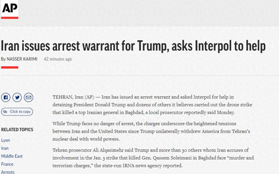 (美联社:伊朗向特朗普发出“逮捕令”,并请求国际刑警组织协助)
