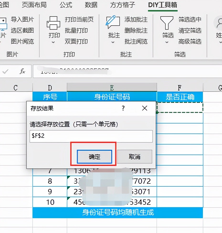 5.接着鼠标选择F2单元格作为存放位置,点击【确定】