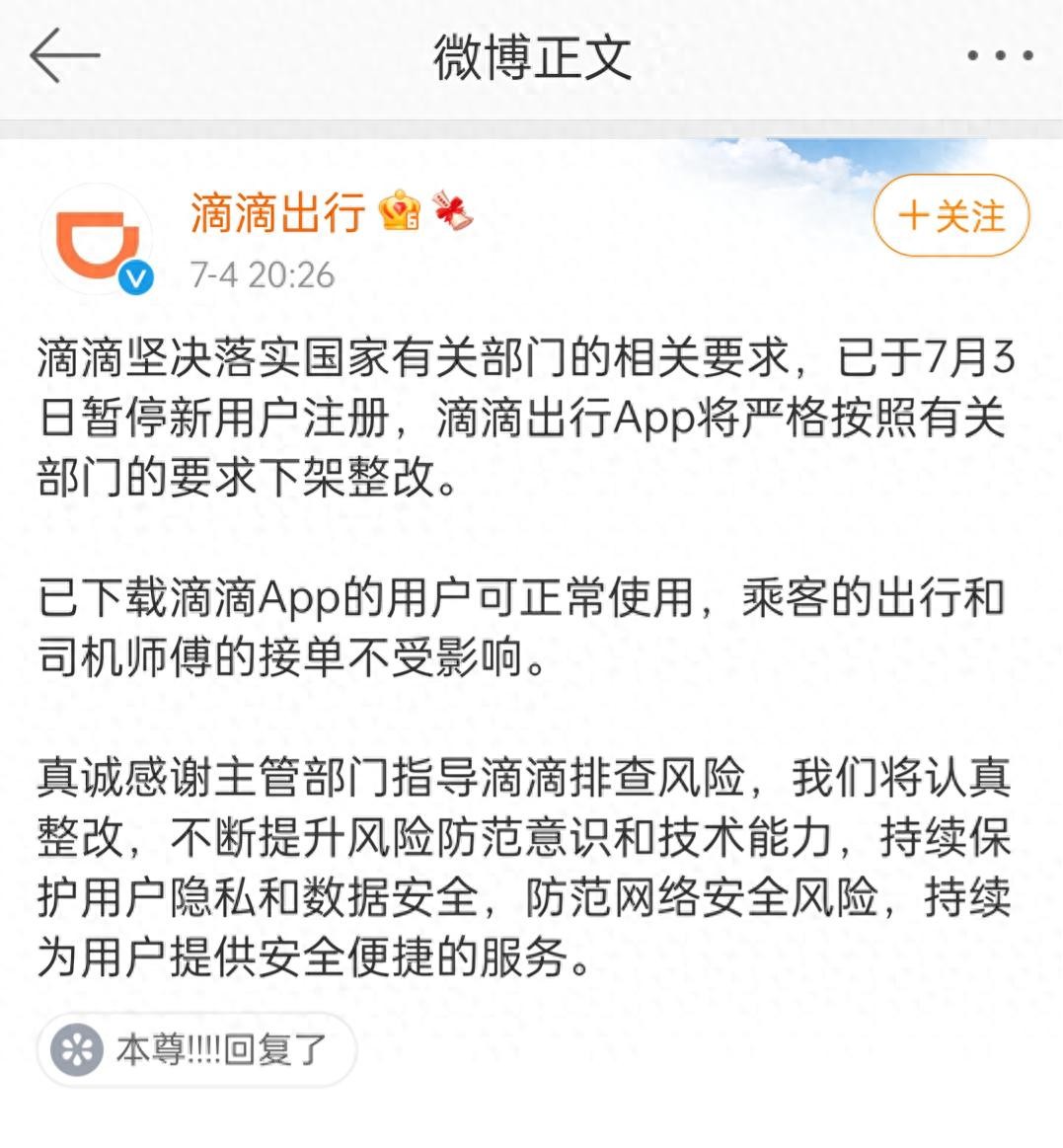 7月4日晚8点半左右,滴滴出行官方微博针对下架问题作出回应。全文如下: