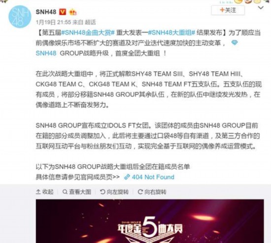 1月19日晚,SNH48官微发文,表示为了顺应当前偶像娱乐市场不断扩大的赛道及对产业迭代速度加快的主动变革, GROUP战略升级,将全团大重组。还透露在此次重组中,将正式解散五支队伍。