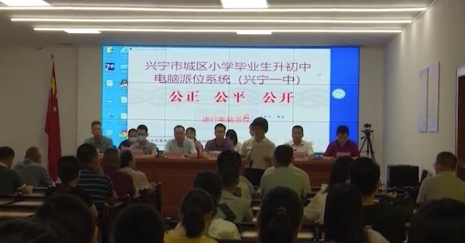 为使兴宁一中初中招生做到公开、公平、公正, 7月16上午,市教育局举行“2021年兴宁一中初中招生电脑派位现场会”,随机派出190人就读兴宁一中初中。市委办、市人大办、市府办、市政协办、市纪委办、市教育局和兴田、宁新、福兴街道等单位相关负责人,及部分教师、家长、学生代表和公证员近百人现场见证了电脑派位。