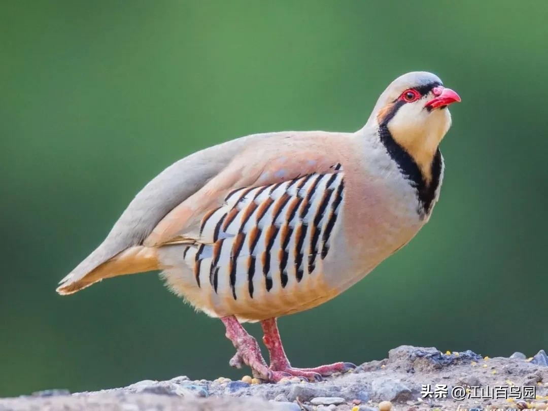 石鸡,是中型雉类,我的家乡人们依据它的叫声,称其为“呱呱鸡”,体长35厘米左右,体重约0.5公斤。体型粗胖,体态浑圆,体羽艳丽。两胁具十余条显著的黑色和栗色横斑。嘴、腿、脚和眼周为珊瑚红色,眼的上方有一条宽宽的白纹。围绕头侧和黄棕色的喉部有完整的黑色环带。上体紫棕褐色,胸部灰色,腹部棕黄色。雌雄羽色机乎相同,只是雄性略大一些。