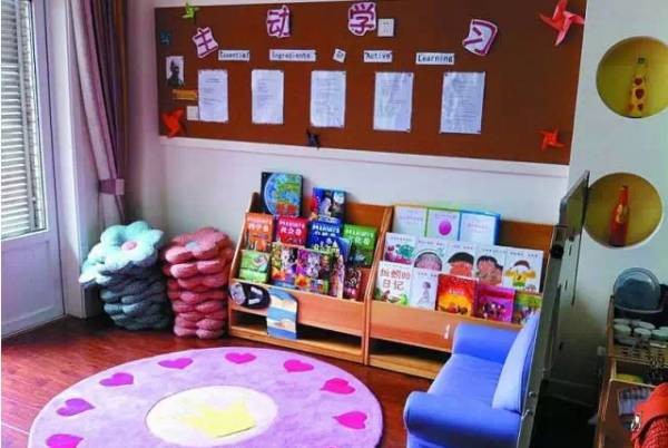 在墙的角落里放阅读区,加上这个粉红色的墙壁真的很温暖又有安全感,相对来说比较简单,不知道实际运用孩子们是否会捧场?