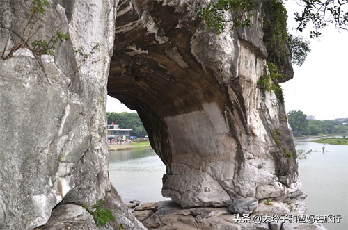 象鼻山不仅外形酷似大象,山中还有很多奇景,最美的就是“象山水月”。象腿和象鼻之间的洞是圆形的,漓江水从中流淌,夜晚的时候山洞倒映在水里就宛若明月照在水中央。不过象山景区的营业时间只到晚上六点,所以我们没看到传说中的奇特美景,要去做船才行,而且可能是枯水期,漓江水也没有在水洞中流动,或许要七八月份来游玩才可以。