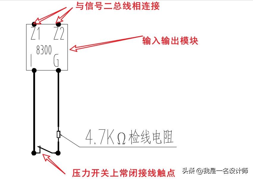 而另一组“常闭”线路通常是和火灾自动报警系统的“输入模块”相连接,就拿比较常见的8300模块为例简单示意下接线逻辑;