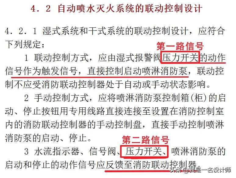所以“压力开关”这个小东西产生的信号要去往两个地方,一个地方是自动喷淋泵的控制柜,另一个地方是火灾自动报警系统的火灾报警控制器。这一点在《火灾自动报警系统设计规范》GB 50116-2013的4.2条中有比较详细的相关描述。