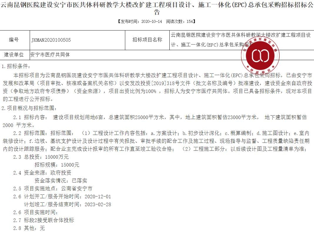 昨天(10月14日),云南昆钢医院建设安宁市医共体科研教学大楼改扩建工程项目设计、施工一体(EPC)总承包采购招标发布,云南昆钢医院再次拉开新征程。