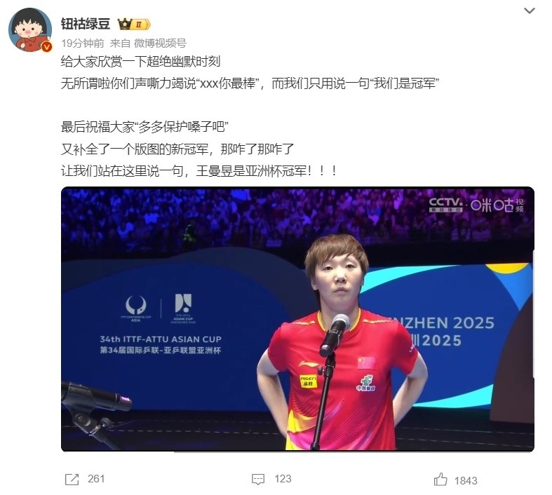 王曼昱夺冠采访,现场响起“孙颖莎你最棒!”王曼昱用6个字回击