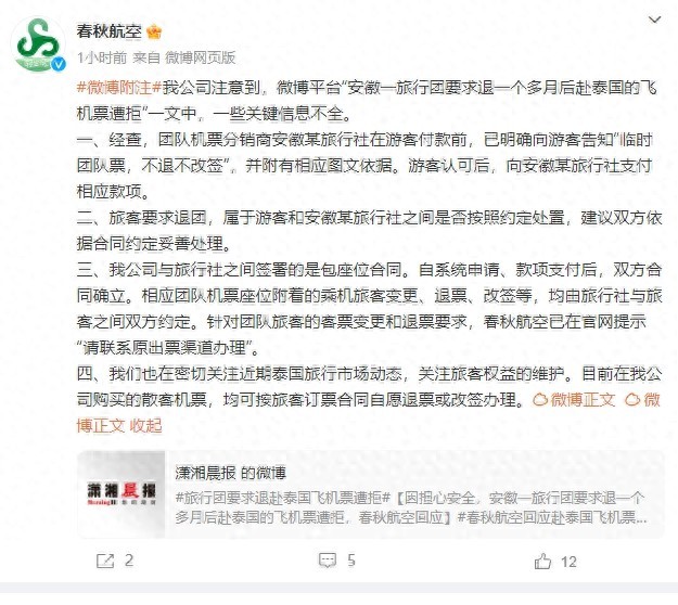 旅行团欲退一个多月后赴泰国机票遭拒,春秋航空再回应:不安全是旅客担忧,非