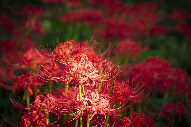 在日本,彼岸花被称为“幽灵花”,寓意着生死两隔。人们相信,在中元节,也就是鬼门大开的日子,彼岸花会在路边盛放,引导着逝者的灵魂前往另一个世界。那一朵朵艳丽的花朵,像是来自黄泉的使者,静静地伫立在那里,见证着灵魂的来来往往。这种与死亡、阴间紧密相连的意象,让彼岸花又多了“死亡的召唤”这一花语。它的存在,仿佛是在提醒着人们,生命的无常和死亡的必然。