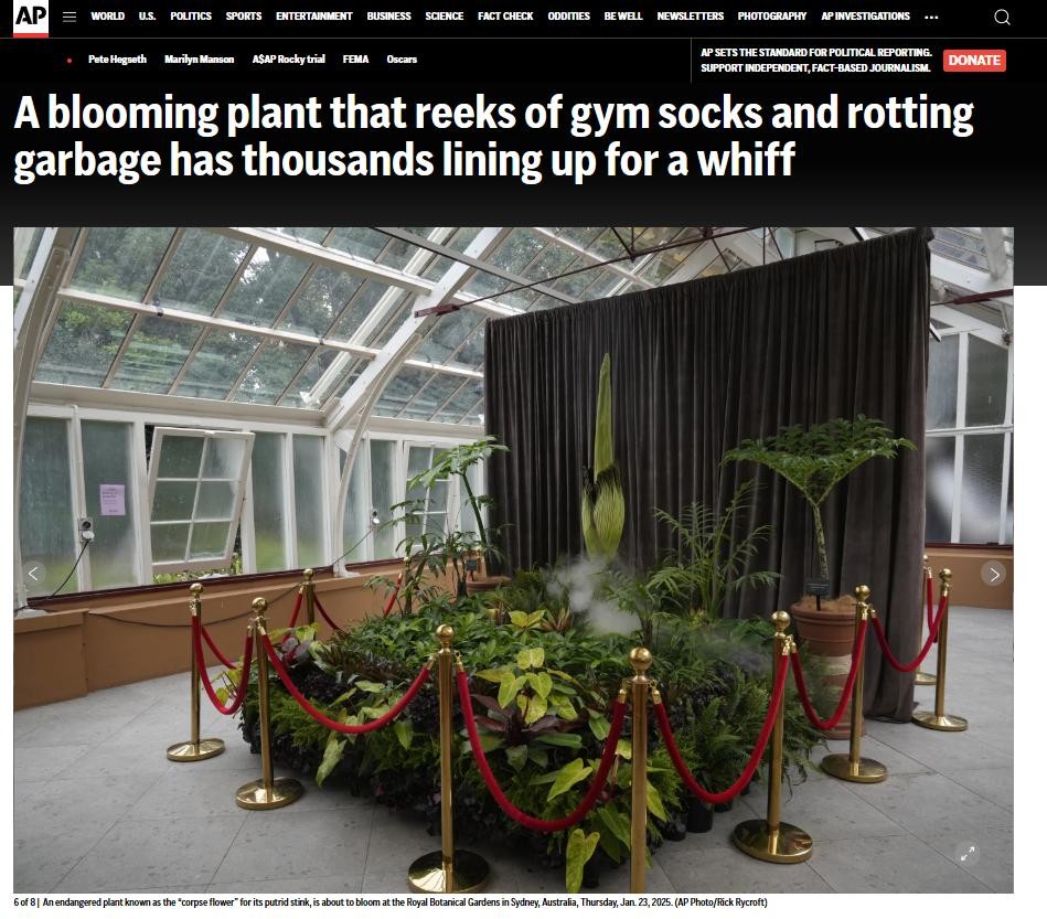 当地时间1月23日,在悉尼皇家植物园里,一种濒危植物罕见地绽放了,发出类似腐烂肉类的气味,吸引数千人排队参观。