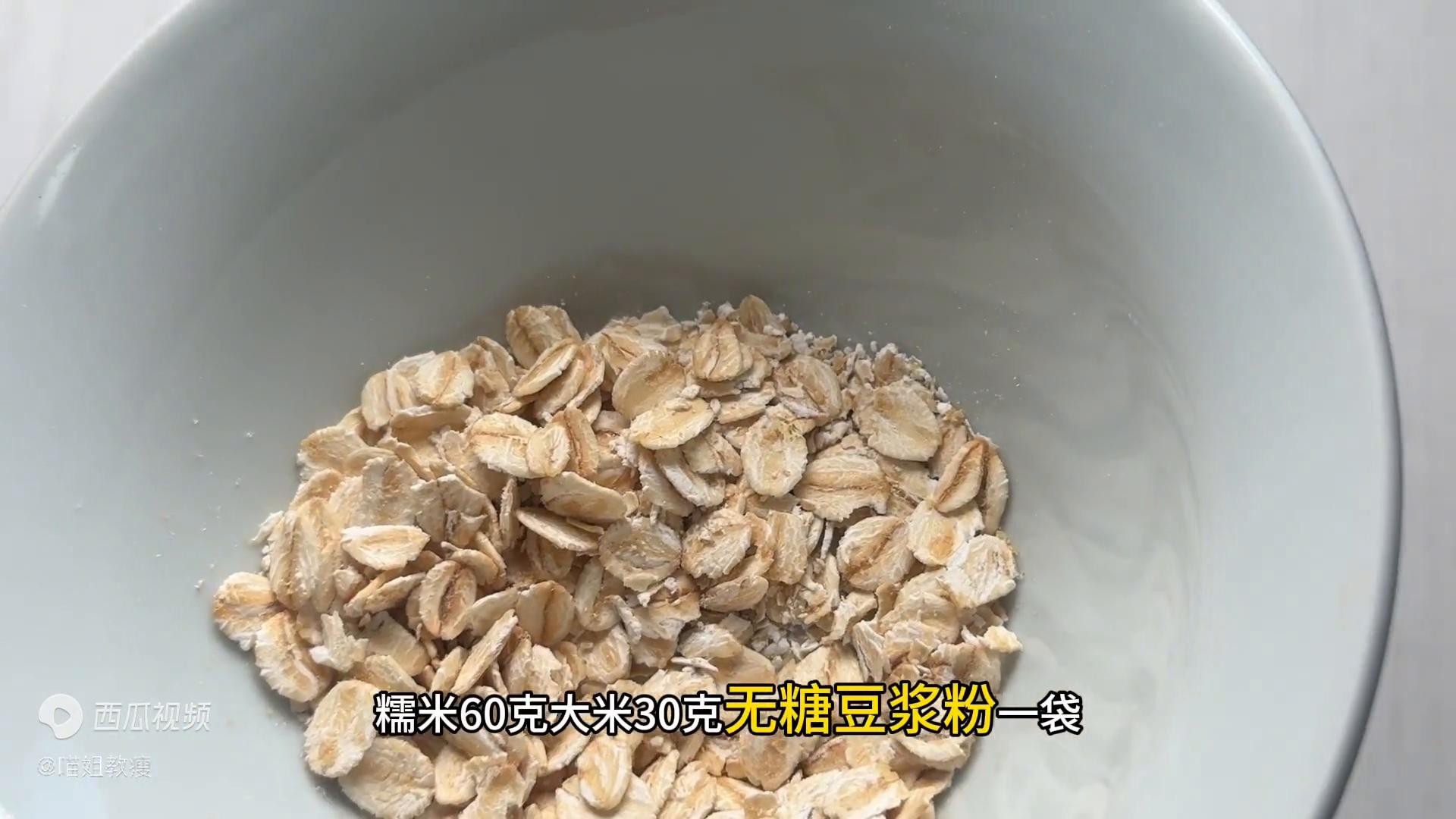 ·先准备食材:糯米60克、大米30克、无糖豆浆粉一袋、山药粉30克、厚粒燕麦片10克,直接省去煮山药的过程,太爽了。山药粉选麸烤淮山药粉,这个粉适合天天吃,也可以蒸馒头,或者早上直接开水冲泡,坚持喝一个月,脸都不黄了。