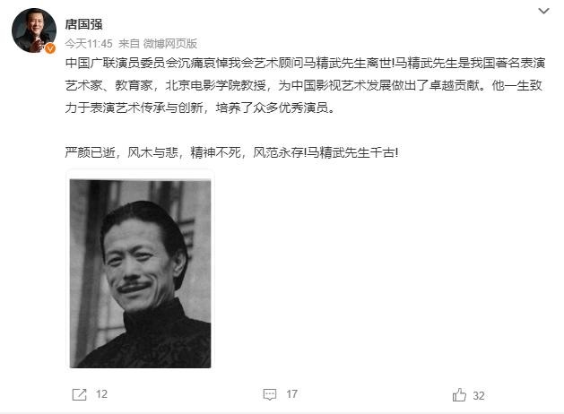 演员唐国强也发布微博:中国广联演员委员会沉痛哀悼我会艺术顾问马精武先生离世!马精武先生是我国著名表演艺术家、教育家,北京电影学院教授,为中国影视艺术发展做出了卓越贡献。他一生致力于表演艺术传承与创新,培养了众多优秀演员。
