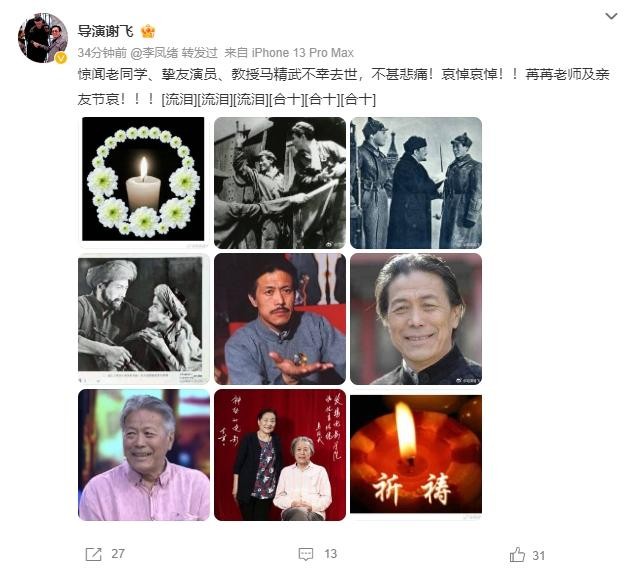得知马精武去世的消息,导演谢飞发微博悼念:惊闻老同学、挚友演员、教授马精武不幸去世,不胜悲痛!哀悼哀悼!