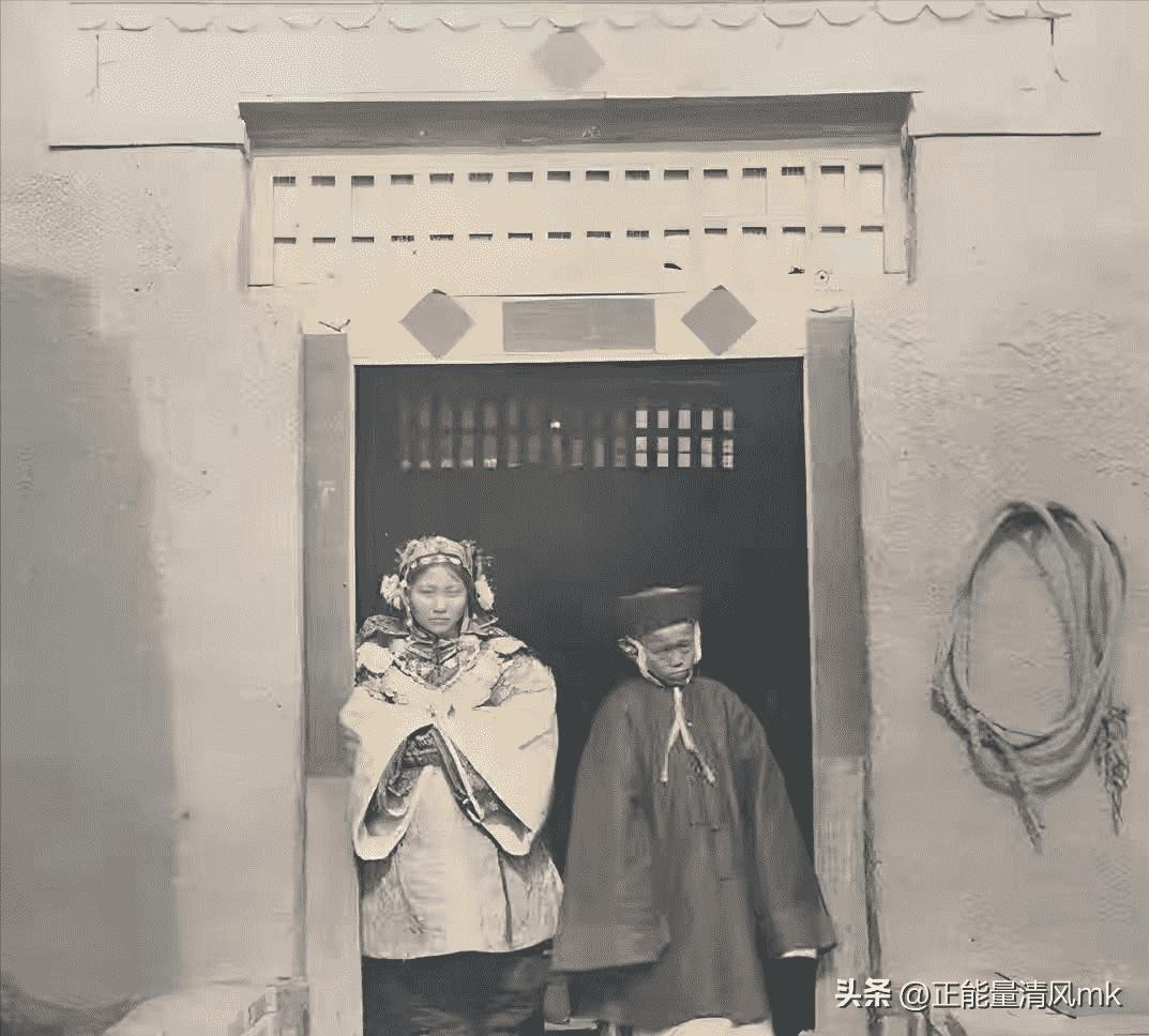 这是一张童婚照片,清末时期,15岁童养媳和13岁丈夫的合影。