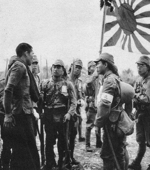 日军面对一个抓来的中国青年投以怀疑的目光,他们认为青年是化了妆的军人
