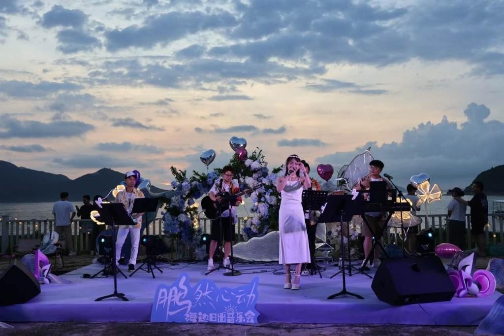 音乐会围绕“诗与远方”主题,由大鹏本地乐队上台献唱。山海之间,音乐、海风、落日,星河,还有什么能比这更惬意。
