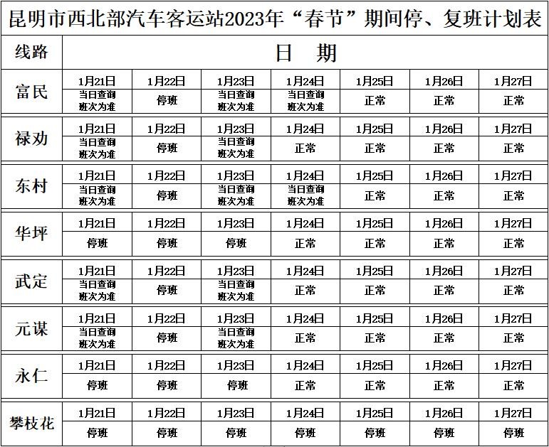 为了便于广大旅客有计划安排春节期间的出行,昆明市西北部汽车客运站根据实际情况,调整了春节期间运营班车停复班计划。现将春节期间发车和停班信息公布如下:
