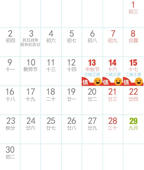 六、中秋节:9月13日放假,与周末连休。