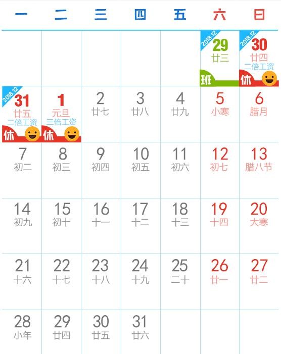 一、元旦:2018年12月30日至2019年1月1日放假调休,共3天。2018年12月29日(星期六)上班。