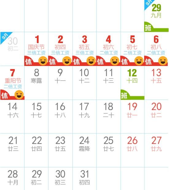 七、国庆节:10月1日至7日放假调休,共7天。9月29日(星期日)、10月12日(星期六)上班。