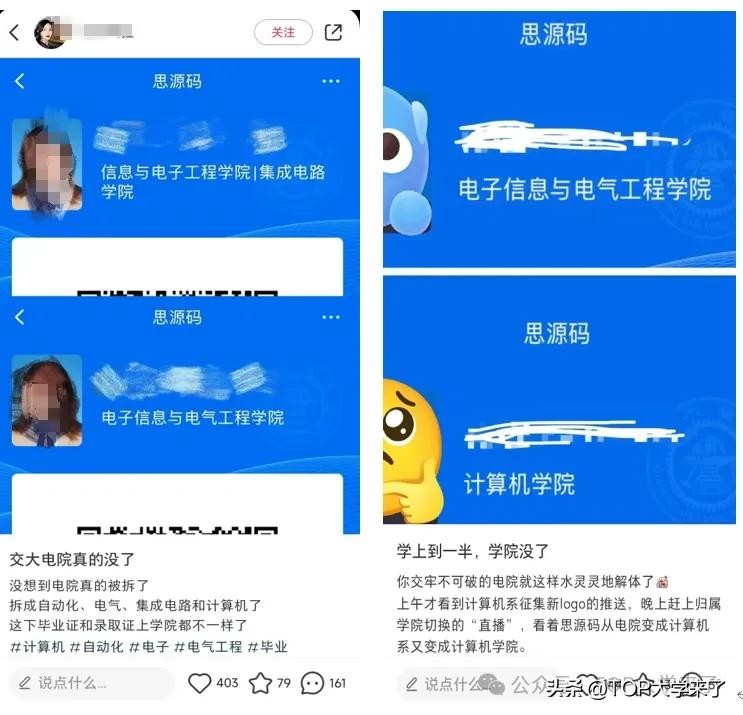 近日,上海交通大学电子信息与电气工程学院(电院)的拆分事宜成为网路内外热议的焦点。不少电院同学在朋友圈、小红书分享学院名称变更的截图,“拆分”“再见”“纪念” 等成为热门配文。