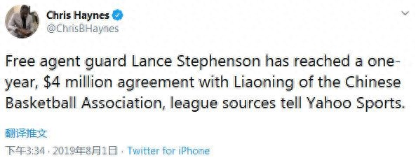 史蒂芬森真的来了!8月1日消息,据名记克里斯-海恩斯报道,史蒂芬森与辽宁队达成1年400万美元的合同,新赛季将征战CBA。