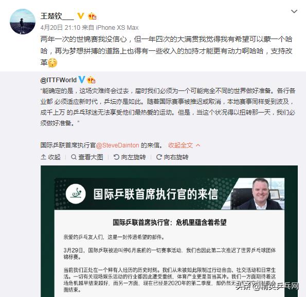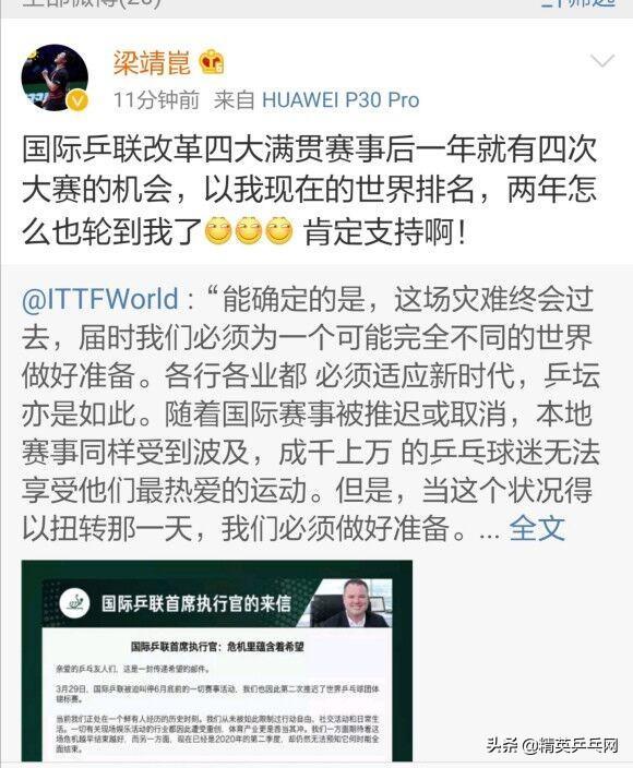 面对国际乒联的“宫斗”,国乒始终没有发声。国乒的沉默其实很简单,无论取消还是改名,国乒的硬实力依然在那摆着,想拿单项还是想拿大满贯都得和国乒过招,能赢了国乒你叫啥都行,赢不了国乒,谈什么都是白扯。不过4月20日正在澳门隔离集训的国乒梁靖崑和王楚钦却罕见地同时更新微博,一同表示对新大满贯的向往,表达了对国际乒联CEO丹顿的支持,这是不是可以说明国乒的态度呢?欢迎小伙伴们在评论区发表自己的看法。