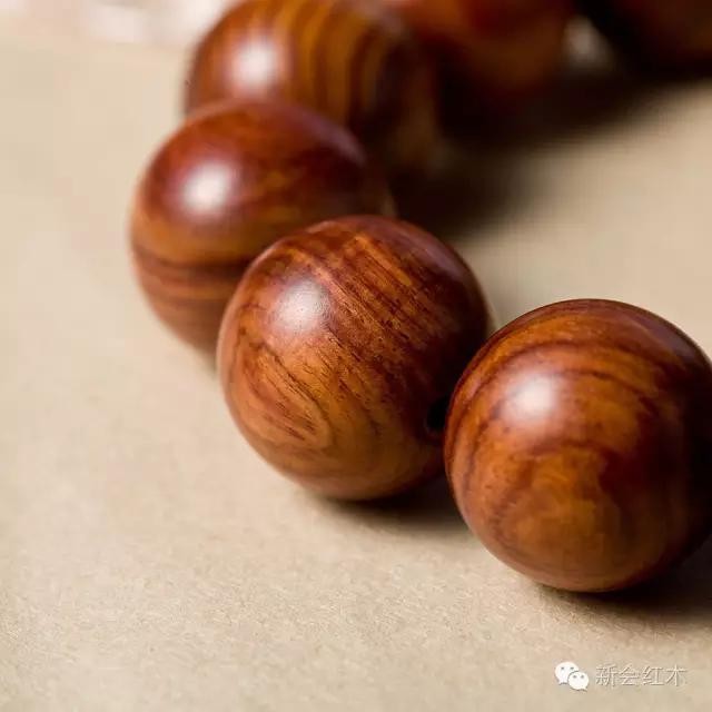 (4)纹路:紫檀柳珠子多是顺纹的,纹路发红且感觉很淡,黄花梨的纹路很少有发红的,个别也是紫色变浅过渡成红的。