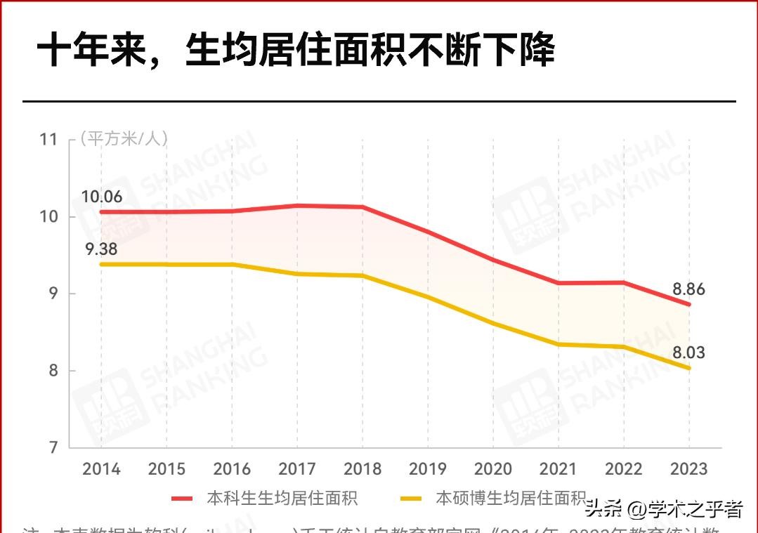 根据国务院发布的《普通高等学校建筑面积指标》要求,本科生、研究生和博士生的校舍建筑面积应分别达到10㎡/生、15㎡/生和20㎡/生(含公摊面积)。然而实际情况却远未达标。