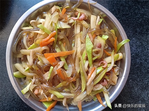 1.准备喜欢的菜,我准备的是西葫芦炒粉丝,胡萝卜切丝,西葫芦切丝,将粉条提前泡软,放入锅中炒熟即可备用。