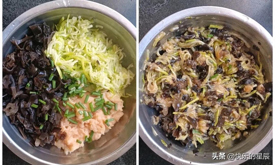 1.准备食材:将鸡胸肉搅碎,西葫芦擦丝放盐杀水后切碎些,木耳泡发后用水抄一下切成碎,放入葱末,耗油,油,盐,鸡精搅拌均匀备用。
