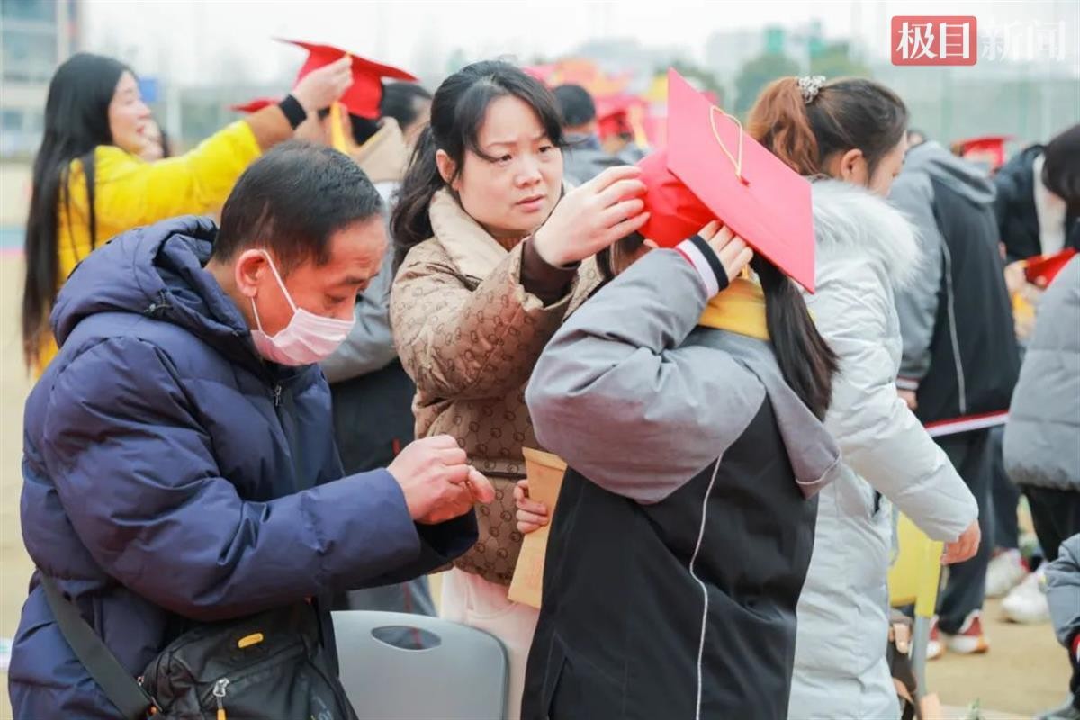 家长们则以温柔的双手,为孩子们佩戴成人帽和“2025高考加油”“为明必胜”“全力以赴”“坚持到底”等字样的成人胸章。家长们轻轻拨动着孩子的帽穗,细心地整理着孩子的衣衫,每一个动作都蕴含着对孩子未来的深切期许。